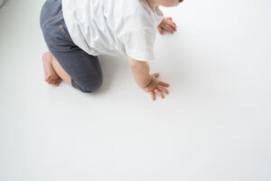 場所見知りの環境の変化からなのか、はじめは床に置かれると泣けてきてしまった弟くん。
