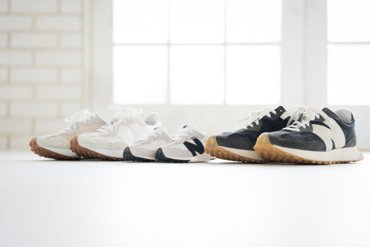 今回は諸事情があって実際に履いた写真は撮ることができませんでしたが、家族でお揃いのニューバランスのスニーカーを並べて撮影しました。